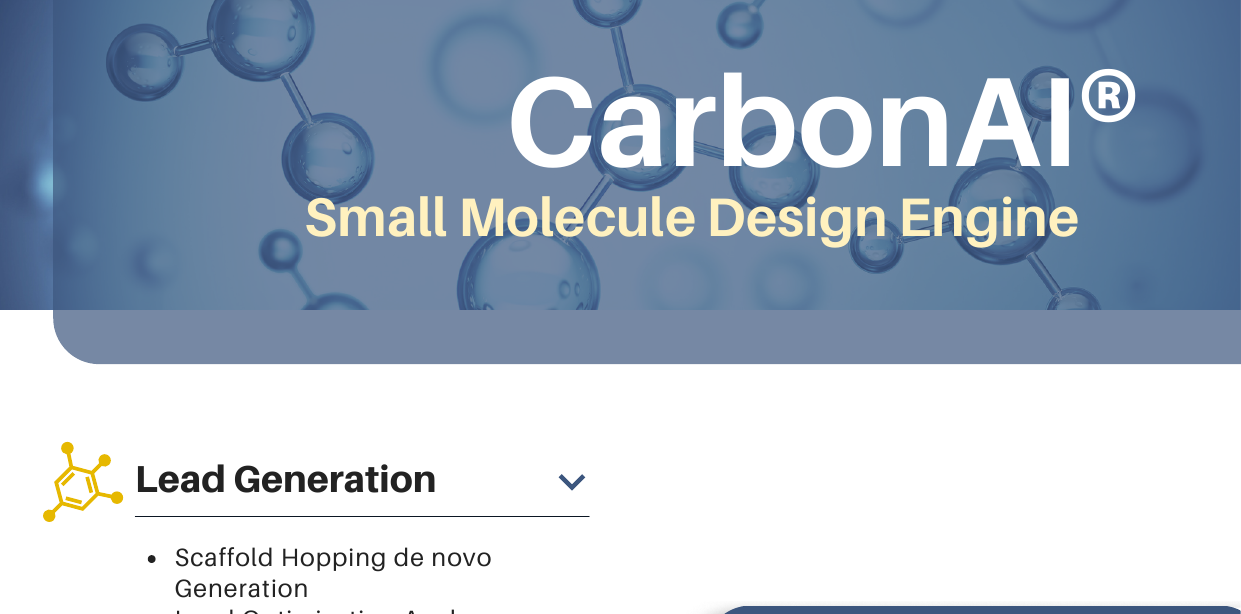 CarbonAI® is our advanced AI platform for small molecule drug discovery. It leverages deep learning models trained on proprietary chemical data to generate novel compounds with optimized properties for target engagement, selectivity, and drug-like characteristics.