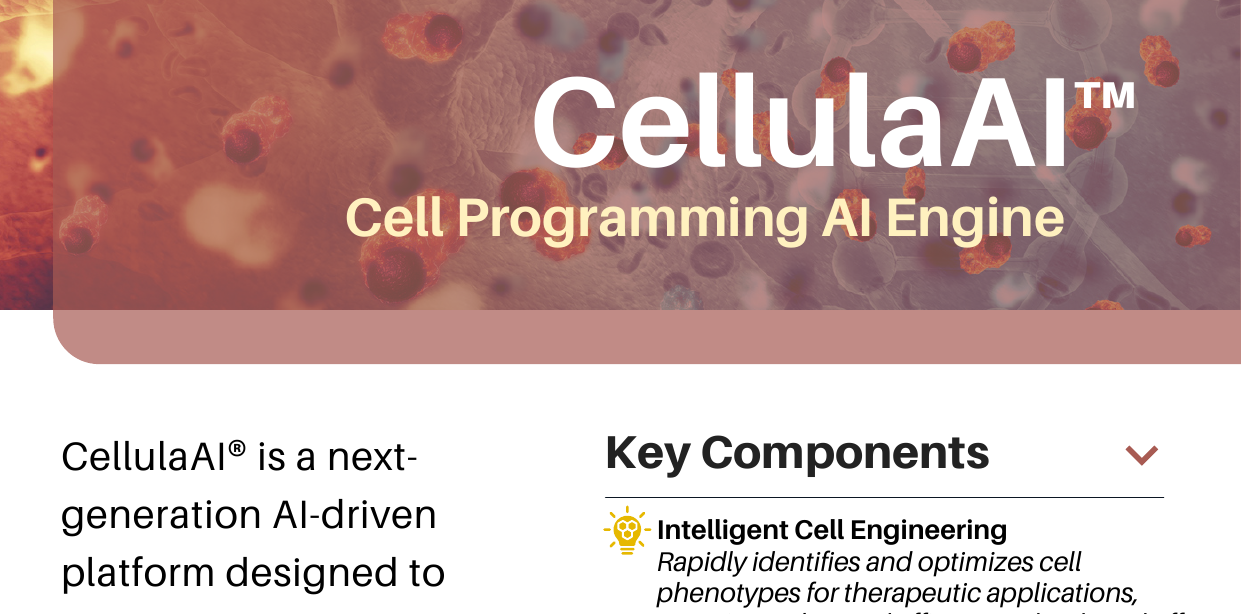 CellulaAI® harnesses machine learning to optimize cell engineering. Using AI to program cellular behavior, it accelerates development of cell therapies including CAR-T, stem cell treatments, and gene-edited cellular products.
