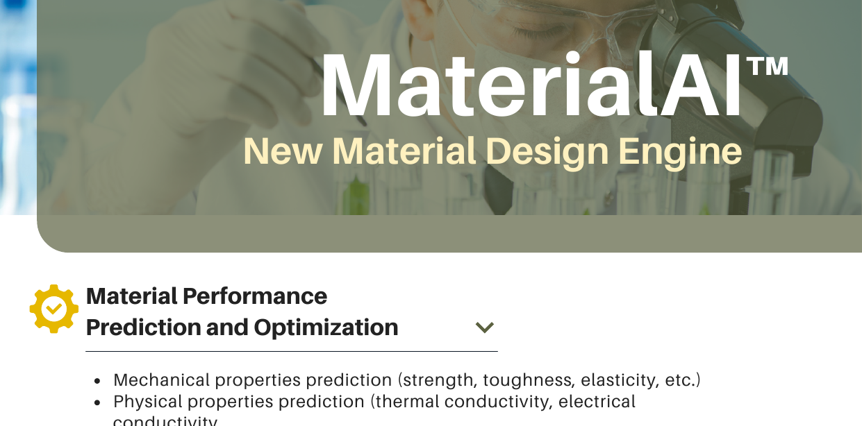 MaterialAI® discovers novel materials for drug delivery and medical devices. Using AI to predict material properties, it accelerates development of biocompatible materials with targeted functionality.