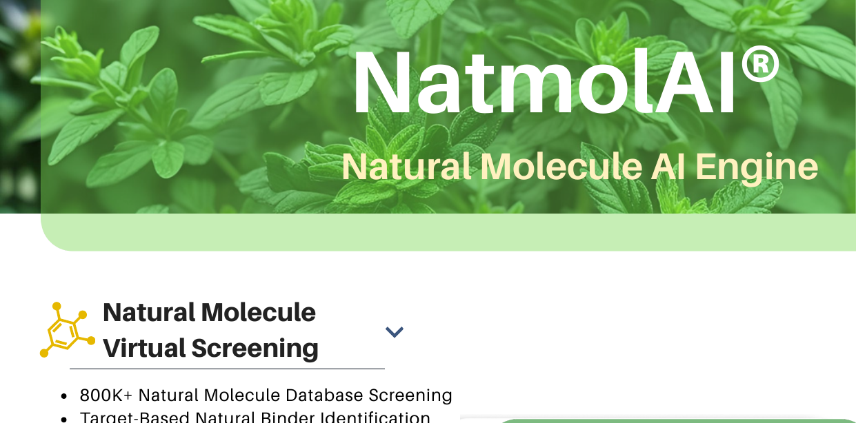 NatmolAI® unlocks the therapeutic potential of natural products. Our AI analyzes vast natural compound libraries to identify bioactive molecules and optimize their drug-like properties while maintaining efficacy.