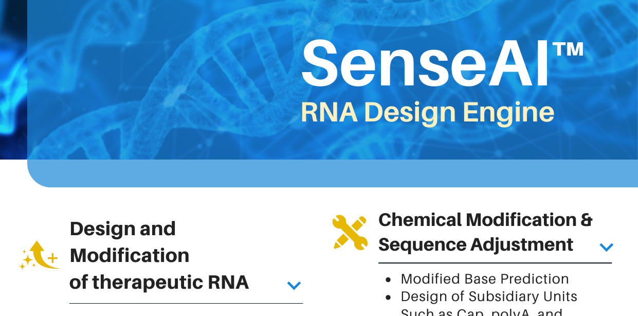 SenseAI® designs optimized RNA therapeutics including mRNA, siRNA, and ASOs. Our AI predicts secondary structures, stability, and efficacy to accelerate RNA-based drug development.